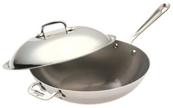 - Rounded, wok-like, 12-inch pan with flat bottom pan for stir-frying